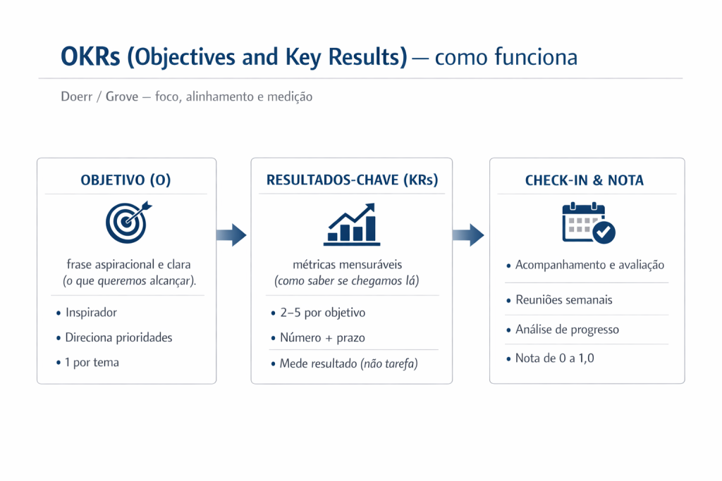 OKR funciona com cadência: define, mede, ajusta. Isso combina com growth porque growth é experimento + iteração.